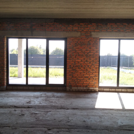 На першому поверсі розташована велика вітальня площею понад 40 м². Також передпокій, санвузол, топкова/пральня, кухня-вітальня-сходи, тераса, навіс для авто.